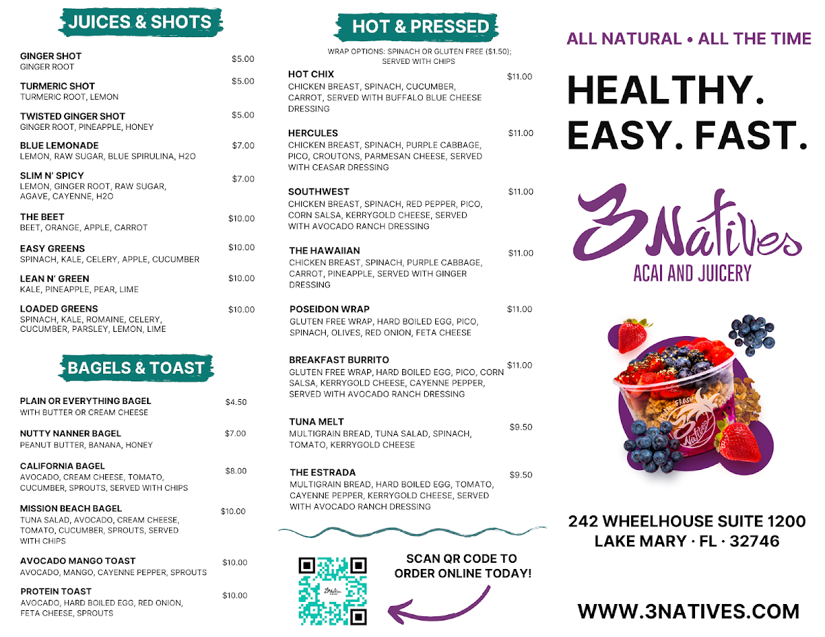 3Natives is a health food haven nestled in Lake Mary, FL, offering vibrant, nutrient-packed dishes that satisfy both the body and soul. Their Acai Bowls are a standout—loaded with fresh fruits like kiwi, strawberry, and banana paired with crunchy granola, honey, and unique toppings such as hemp seeds and coconut shavings, delivering a delightful balance of creamy and crisp textures. The Smoothie selection features energizing blends like "Going Green" with kale and coconut water, and the protein-rich "Chuck Norris," perfect for a post-workout boost.
